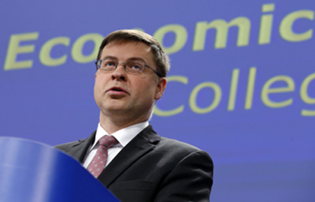 2月25日,在比利時首都布魯塞爾,歐盟委員會副主席、負責歐元與社會事務的委員東布羅夫斯基出席新聞發(fā)布會。 東布羅夫斯基當日在新聞發(fā)布會上表示,歐委會決定同意歐元區(qū)第二大經濟體法國推遲兩年至2017年實現(xiàn)歐盟規(guī)定的減赤目標。