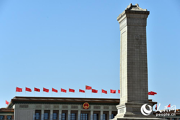 3月1日,2015年全國兩會即將召開。當(dāng)日,北京風(fēng)和日麗,藍(lán)天空氣質(zhì)量好,北京天安門廣場、人民大會堂,紅旗迎風(fēng)招展,喜迎全國兩會開幕。