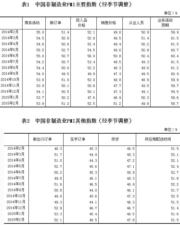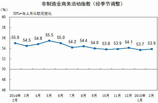 2015年2月,中國非制造業(yè)商務(wù)活動(dòng)指數(shù)為53.9%,比上月上升0.2個(gè)百分點(diǎn),高于榮枯線3.9個(gè)百分點(diǎn),表明我國非制造業(yè)繼續(xù)保持平穩(wěn)擴(kuò)張勢(shì)頭。