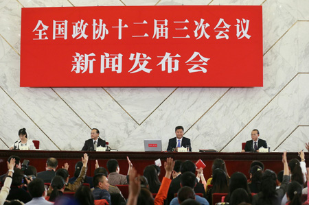 3月2日,全國政協(xié)十二屆三次會議新聞發(fā)布會在北京人民大會堂舉行,大會發(fā)言人呂新華介紹會議有關情況并回答中外記者提問。 在回答記者有關反腐問題時,呂新華說,過去一年,黨中央堅持無禁區(qū)、全覆蓋、零容忍,嚴肅查處腐敗分子,著力營造不敢腐、不能腐、不想腐的政治氛圍,成效明顯。在反腐斗爭中,發(fā)現(xiàn)一起查處一起,發(fā)現(xiàn)多少查處多少,絕不封頂設限,沒有不受查處的“鐵帽子王”。