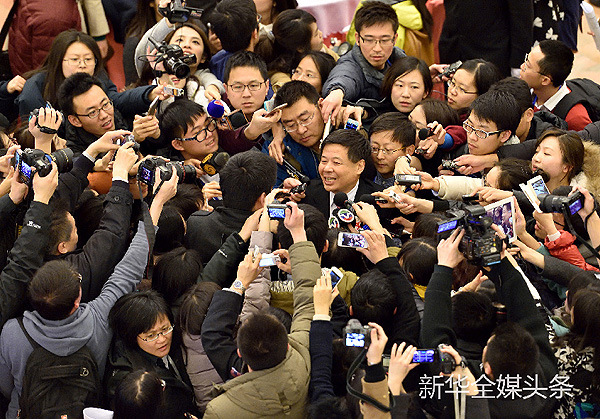 記者圍堵采訪全國政協(xié)委員、財政部副部長朱光耀。“財神爺”就是受關(guān)注。新華社記者 李鑫 攝