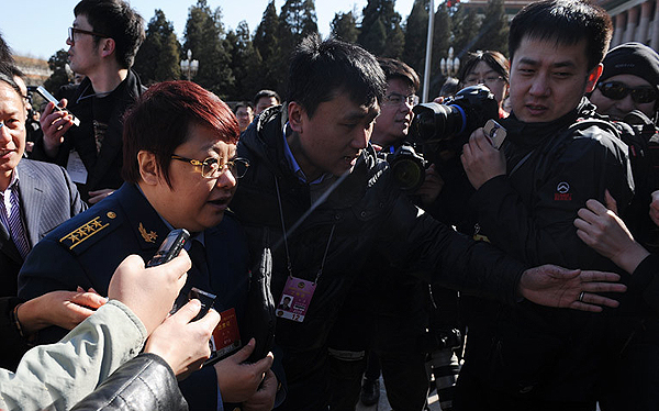 3月3日,中國(guó)人民政治協(xié)商會(huì)議第十二屆全國(guó)委員會(huì)第三次會(huì)議在北京人民大會(huì)堂開幕。這是記者們?cè)谌嗣翊髸?huì)堂東門外廣場(chǎng)采訪全國(guó)政協(xié)委員韓紅。 新華網(wǎng) 翟子赫 攝
