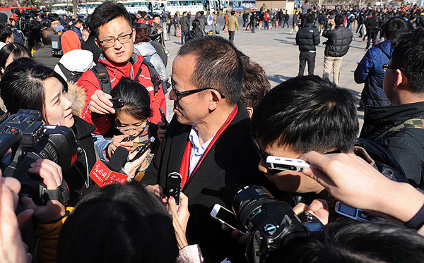 3月3日,中國人民政治協(xié)商會(huì)議第十二屆全國委員會(huì)第三次會(huì)議在北京人民大會(huì)堂開幕。這是記者們?cè)谌嗣翊髸?huì)堂東門外廣場(chǎng)采訪全國政協(xié)委員俞敏洪。 新華網(wǎng) 翟子赫 攝