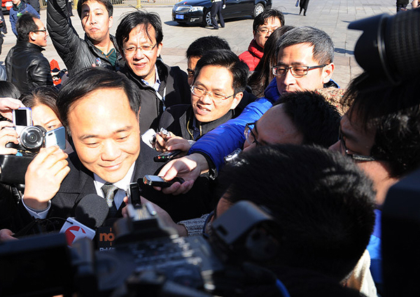 3月3日,中國人民政治協(xié)商會議第十二屆全國委員會第三次會議在北京人民大會堂開幕。這是記者們在人民大會堂東門外廣場采訪全國政協(xié)委員李書福。 新華網(wǎng) 翟子赫 攝