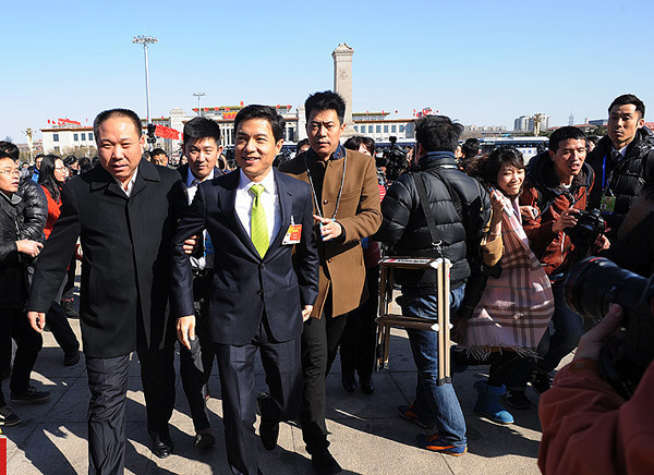 3月3日,中國人民政治協(xié)商會議第十二屆全國委員會第三次會議在北京人民大會堂開幕。這是記者們在人民大會堂東門外廣場拍攝全國政協(xié)委員李彥宏。 新華網(wǎng) 翟子赫 攝