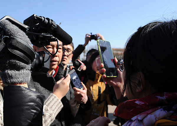 3月3日,中國(guó)人民政治協(xié)商會(huì)議第十二屆全國(guó)委員會(huì)第三次會(huì)議在北京人民大會(huì)堂開(kāi)幕。這是記者們?cè)谌嗣翊髸?huì)堂東門外廣場(chǎng)拍攝全國(guó)政協(xié)委員陳凱歌。 新華網(wǎng) 翟子赫 攝