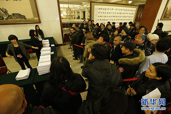 3月5日,第十二屆全國(guó)人民代表大會(huì)第三次會(huì)議在北京人民大會(huì)堂開幕。這是媒體記者排隊(duì)領(lǐng)取政府工作報(bào)告等文件。 新華社記者 沈伯韓 攝