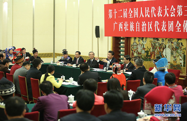 3月8日,中共中央總書記、國家主席、中央軍委主席習近平參加十二屆全國人大三次會議廣西代表團的審議。 新華社記者 蘭紅光 攝