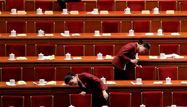 2015年3月3日,北京,全國政協(xié)十二屆三次會議開幕會在人民大會堂舉行。服務(wù)員在會后檢查會場。
