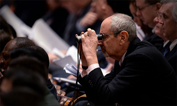十二屆全國人民代表大會第三次會議在人民大會堂舉行開幕會。一名外國大使在會上使用望遠(yuǎn)鏡。