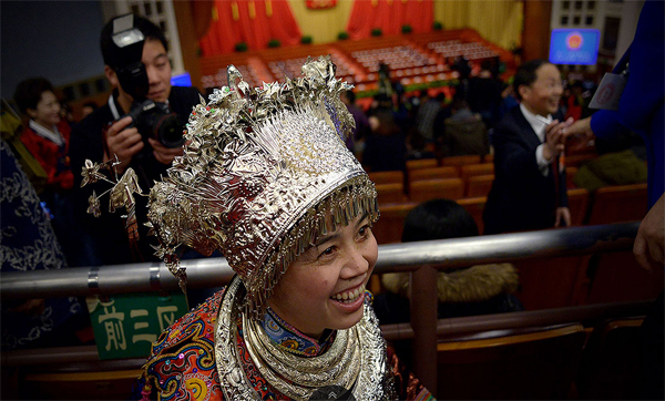 十二屆全國人民代表大會第三次會議在人民大會堂舉行開幕會。少數(shù)民族代表盛裝出席開幕會。