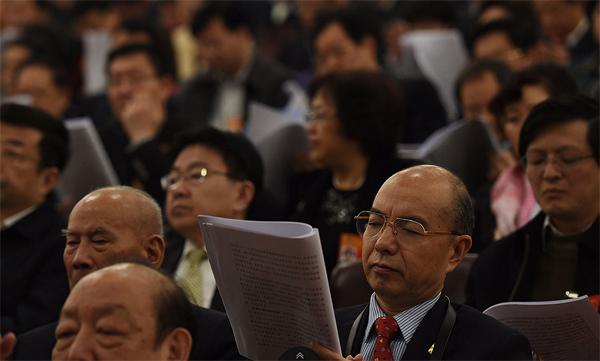 十二屆全國(guó)人民代表大會(huì)第三次會(huì)議在人民大會(huì)堂舉行開幕會(huì)。人大代表正在閱讀會(huì)議議程。