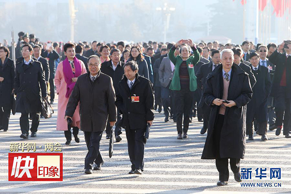 3月10日,全國政協(xié)十二屆三次會議在北京人民大會堂舉行第三次全體會議。這是全國政協(xié)委員抵達天安門廣場。新華社記者 呂迅 攝