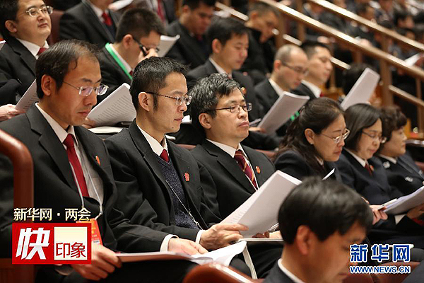 3月12日,十二屆全國人大三次會議在北京人民大會堂舉行第三次全體會議。這是最高人民法院工作人員旁聽大會。新華社記者 邢廣利 攝