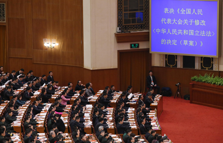 第十二屆全國人民代表大會第三次會議圓滿完成各項議程15日上午在人民大會堂閉幕。大會表決通過關(guān)于修改立法法的決定,國家主席習(xí)近平簽署第20號主席令予以公布。 修改后的立法法將“稅收”專門列出,作為只能制定法律的事項,明確“稅種的開征、停征和稅收征收管理的基本制度”只能由法律規(guī)定。 圖為代表們在會上表決。