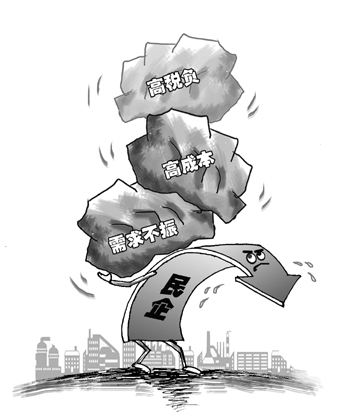 全國300多名民營企業(yè)家在山東濟南出席全國工商聯(lián)十一屆三次執(zhí)委會時,普遍表示“日子難過”。當前緊繃的資金鏈、居高不下的稅負給企業(yè)帶來前所未有的生存壓力,許多民企尤其是中小企業(yè)經(jīng)營難以為繼,生存舉步維艱。有的企業(yè)家對產(chǎn)業(yè)結構調(diào)整、轉(zhuǎn)型升級信心不足,對經(jīng)濟中出現(xiàn)的諸多不確定因素心存恐懼。需求不振、高成本、高稅負與當前的民企生死攸關。