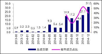 種種跡象顯示,隨著市場容量的擴(kuò)大和流動性的提升,新三板正在進(jìn)入高速發(fā)展階段。3月23日,全國股轉(zhuǎn)系統(tǒng)掛牌公司達(dá)2130家,總股本906.59億股,其中無限售股本324.01億股,總市值達(dá)8499.48億元。掛牌公司股票成交108344.64萬元。其中做市方式轉(zhuǎn)讓的股票成交76116.78萬元,協(xié)議方式轉(zhuǎn)讓的股票成交32227.86萬元。今年以來,市場成交累計195億元,其中做市股票成交117.6億元。