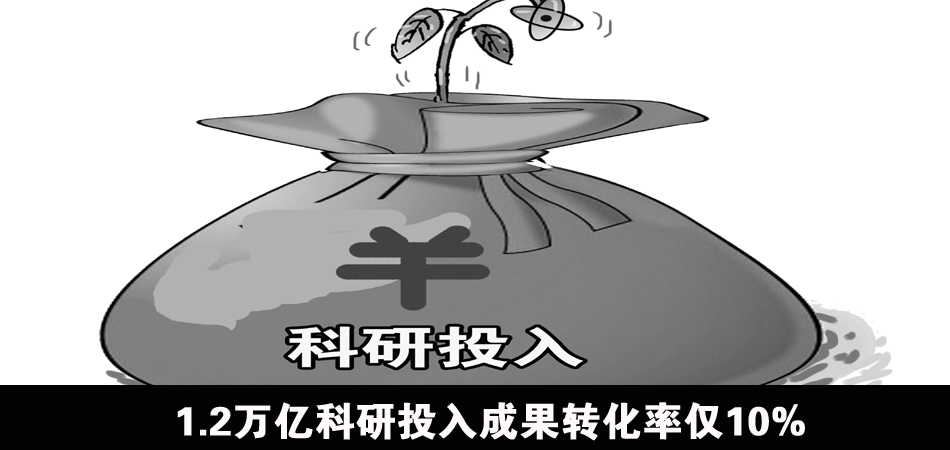 數(shù)據(jù)顯示,2013年我國全社會(huì)研發(fā)投入已達(dá)1.2萬億元左右,其中財(cái)政科技支出5000億元,居世界前列,但原發(fā)改委副主任張曉強(qiáng)表示,我國科技成果轉(zhuǎn)化率僅為10%,遠(yuǎn)低于發(fā)達(dá)國家40%的水平。