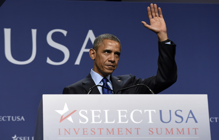 美國(guó)總統(tǒng)奧巴馬23日宣布一系列新的行政舉措,吸引外國(guó)企業(yè)擴(kuò)大對(duì)美直接投資。他表示,美國(guó)聯(lián)邦政府將與各州政府加強(qiáng)招商引資合作,為投資者提供在美投資基本知識(shí)培訓(xùn)服務(wù)、有關(guān)各州投資激勵(lì)政策的在線數(shù)據(jù)庫(kù)和其他投資工具,以幫助投資者確定具體投資對(duì)象以及尋找當(dāng)?shù)貪撛诤献骰锇。圖為3月23日奧巴馬在馬里蘭州出席第二屆“選擇美國(guó)投資峰會(huì)”。