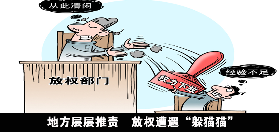 “大道至簡(jiǎn),有權(quán)不可任性。各級(jí)政府都要建立簡(jiǎn)政放權(quán)、轉(zhuǎn)變職能的有力推進(jìn)機(jī)制,給企業(yè)松綁,為創(chuàng)業(yè)提供便利,營(yíng)造公平競(jìng)爭(zhēng)環(huán)境?!苯衲陜蓵?huì)政府工作報(bào)告給簡(jiǎn)政放權(quán)改革進(jìn)一步指明了方向,不過(guò),《經(jīng)濟(jì)參考報(bào)》記者在多地調(diào)研發(fā)現(xiàn),中央一系列簡(jiǎn)政放權(quán)的重要舉措成效顯著,但在權(quán)力層層下放過(guò)程中,一些地區(qū)基層干部因怕?lián)?zé)而“慢作為”“不作為”,同時(shí)因行政事權(quán)下放后人事制度改革缺位,造成“廟已經(jīng)搬走,老和尚還在原地打坐,新廟的和尚又不會(huì)念經(jīng)”的怪象。