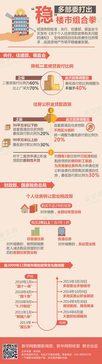 備受關(guān)注的“央版”房地產(chǎn)松綁政策正式落地。30日,央行、住建部、財政部、國稅總局等部門分別下發(fā)房地產(chǎn)新政以穩(wěn)定樓市增長,包括二套首付降為40%,首套房公積金貸款首付降為20%,二套房公積金貸款首付降為30%;此外,個人出售2年以上住房免征營業(yè)稅。至此,加上上周剛剛落地的國土部與住建部發(fā)布的新政,中央方面對樓市已連下三劑猛藥。