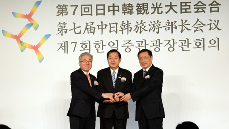 4月11日,在日本東京,中國(guó)國(guó)家旅游局局長(zhǎng)李金早(右)、日本國(guó)土交通大臣太田昭宏(中)與韓國(guó)文化體育觀光部長(zhǎng)官金鐘德合影。