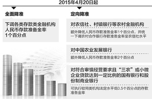 4月19日,央行宣布自20日起下調各類存款類金融機構人民幣存款準備金率1個百分點。在此基礎上,為進一步增強金融機構支持結構調整的能力,加大對小微企業(yè)、“三農”以及重大水利工程建設等的支持力度,自4月20日起對農信社、村鎮(zhèn)銀行等農村金融機構額外降低人民幣存款準備金率1個百分點,并統(tǒng)一下調農村合作銀行存款準備金率至農信社水平;對中國農業(yè)發(fā)展銀行額外降低人民幣存款準備金率2個百分點;對符合審慎經(jīng)營要求且“三農”或小微企業(yè)貸款達到一定比例的國有銀行和股份制商業(yè)銀行可執(zhí)行較同類機構法定水平低0.5個百分點的存款準備金率。