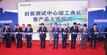三星(中國(guó))半導(dǎo)體有限公司在西安隆重舉行封裝測(cè)試生產(chǎn)線竣工投運(yùn)儀式,與會(huì)嘉賓剪彩。 |