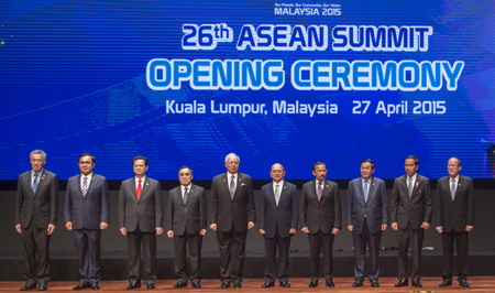 4月27日,在馬來西亞吉隆坡,與會(huì)領(lǐng)導(dǎo)人在東盟領(lǐng)導(dǎo)人會(huì)議開幕式上合影。當(dāng)日,第26屆東盟領(lǐng)導(dǎo)人會(huì)議在馬來西亞吉隆坡開幕。會(huì)議的主要目標(biāo)是確保東盟共同體在今年年底前如期建成,商討制定東盟在2015年后的發(fā)展愿景。