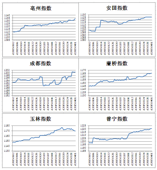 2015年第一季度,亳州、安國、成都、廉橋、玉林、普林6大市場價格指數(shù)走勢基本與與整體走勢一致,尤其是亳州走勢基本吻合。從下圖各大市場具體走勢來看,玉林近期指數(shù)違反常規(guī)走勢出現(xiàn)下跌情況,其主要原因是玉林中藥材市場主要集中香料這一塊,由于近期香料狀況普遍下跌所致。2015年第一季度6大市場指數(shù)走勢如圖2所示。