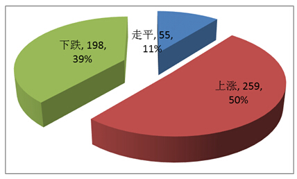 本季度監(jiān)測,512個代表品種中,一季度價格指數(shù)上漲的有258種,占比50.4%;價格下跌的有199種,占比38.9%;價格不變的有55種,占比為10.7%。從數(shù)據(jù)上看上漲品種明顯高于走跌品種,進一步印證了本季度指數(shù)呈現(xiàn)上升的走勢。品種漲跌如圖4所示。