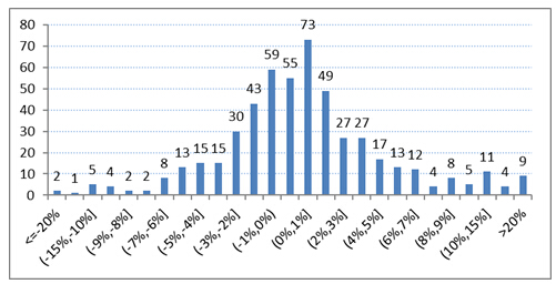 從漲跌各區(qū)間分布來看,513個代表品中,有73個品種漲跌幅度在區(qū)間0和1%之間,占比為14.2%,另外漲幅超過20%的品種有9個,跌幅超過20%的品種有2個。整體來看漲跌幅度與品種個數(shù)之間基本呈現(xiàn)正態(tài)分布,上漲品種稍多于走跌品種,且上漲幅度高于走跌幅度。具體各區(qū)間漲跌品種數(shù)如圖5所示。