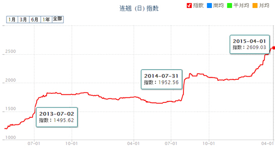 根據(jù)1-3月的“新華經(jīng)參康美中藥材價格指數(shù)”的具體走勢可見,指數(shù)曲線呈現(xiàn)先漲后水平震蕩接著繼續(xù)上漲的趨勢,而且走勢比較平緩的時間段恰巧春節(jié)前后,各大藥材市場陸續(xù)關(guān)門閉市休整,藥材交易比較冷清,所以相對價格波動幅度較小與市場行情基本吻合,另外值得關(guān)注的是3月份以來指數(shù)持續(xù)上漲中,雖然每天漲幅不大,但總體上漲勢頭依然迅猛。2015年第一季度指數(shù)走勢如圖1所示。