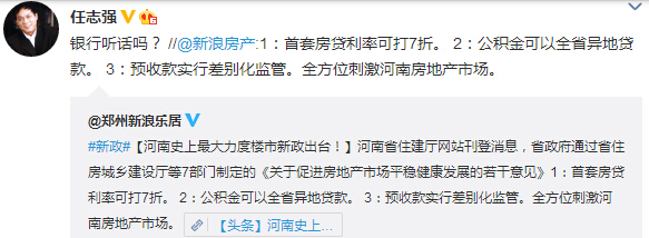對于此次出臺的河南史上最大力度的樓市新政,知名地產(chǎn)商任志強微博中給出評論:“銀行聽話嗎?”