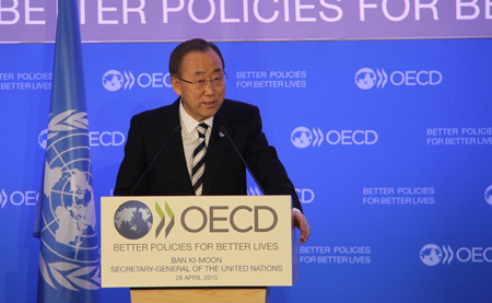 4月28日,聯(lián)合國(guó)秘書(shū)長(zhǎng)潘基文在經(jīng)濟(jì)合作與發(fā)展組織位于巴黎的總部發(fā)表演講。潘基文表示,現(xiàn)有的國(guó)際投融資機(jī)制已難以滿足各國(guó)可持續(xù)發(fā)展需要,國(guó)際社會(huì)應(yīng)加強(qiáng)合作,爭(zhēng)取達(dá)成新的協(xié)議,以改善現(xiàn)有的國(guó)際投融資機(jī)制,促進(jìn)可持續(xù)發(fā)展。