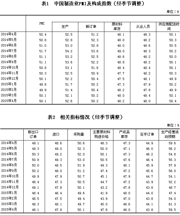 2015年4月,中國制造業(yè)采購經(jīng)理指數(shù)(PMI)為50.1%,與上月持平,連續(xù)兩個月高于臨界點。
