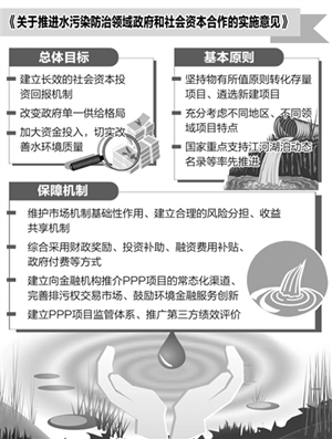 財政部和環(huán)保部日前聯(lián)合發(fā)布《關(guān)于推進(jìn)水污染防治領(lǐng)域政府和社會資本合作的實(shí)施意見》(以下簡稱《意見》),對于下一步水污染防治領(lǐng)域政府和社會資本合作(PPP)項(xiàng)目操作流程作出明確規(guī)范。記者從相關(guān)部門獲悉,從目前情況來看,下一步國家將細(xì)化社會資本投資環(huán)保治理領(lǐng)域的鼓勵措施,包括財政、稅收、貸款優(yōu)惠等內(nèi)容。與此同時,環(huán)保部將完善水污染防治領(lǐng)域特許經(jīng)營管理制度,降低準(zhǔn)入門檻,清理審批限制,拓寬社會資本投入渠道。