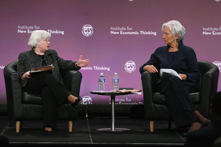 當(dāng)?shù)貢r(shí)間5月6日,美國(guó)首都華盛頓,國(guó)際貨幣基金組織總裁拉加德(右)和美聯(lián)儲(chǔ)主席耶倫出席對(duì)話活動(dòng)。 耶倫表示,盡管低利率環(huán)境容易導(dǎo)致金融冒險(xiǎn)活動(dòng)增加,但目前美國(guó)金融穩(wěn)定風(fēng)險(xiǎn)仍處于溫和水平,沒有明顯提升。