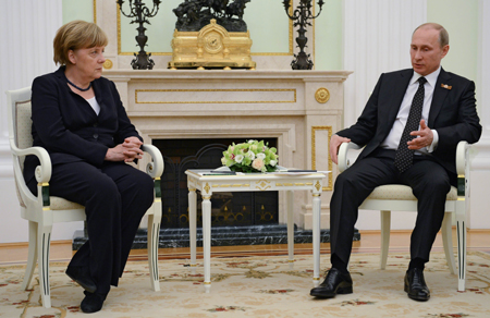 5月10日,俄羅斯總統(tǒng)普京(右)與德國總理默克爾在俄羅斯莫斯科克里姆林宮舉行會談。 德國總理默克爾于10日抵達(dá)莫斯科進(jìn)行訪問。此前,據(jù)俄羅斯“衛(wèi)星”新聞通訊社網(wǎng)站報道,默克爾在有關(guān)場合曾談及與俄建立自貿(mào)區(qū)事宜。她說:“從長遠(yuǎn)來看,我們有可能建立一個大型自由貿(mào)易區(qū),包括俄羅斯在內(nèi)!