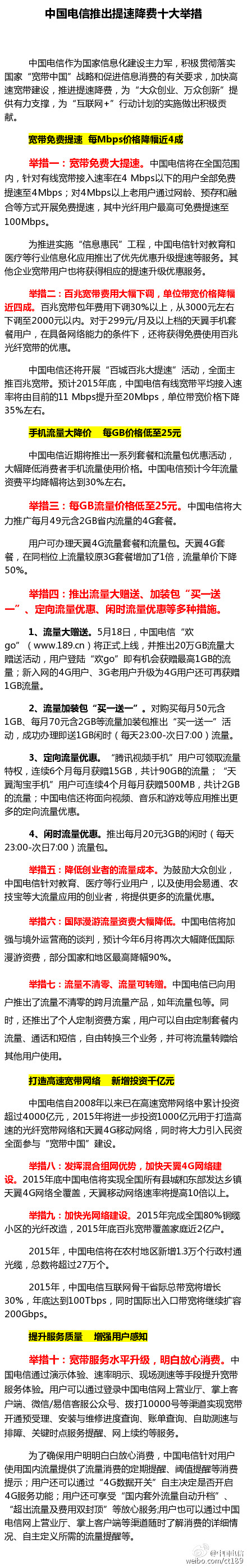 15日從中國電信微博獲悉,中國電信公布提速降費(fèi)十大舉措。包括百兆寬帶費(fèi)用大幅下調(diào),單位帶寬價(jià)格降幅近四成等措施。