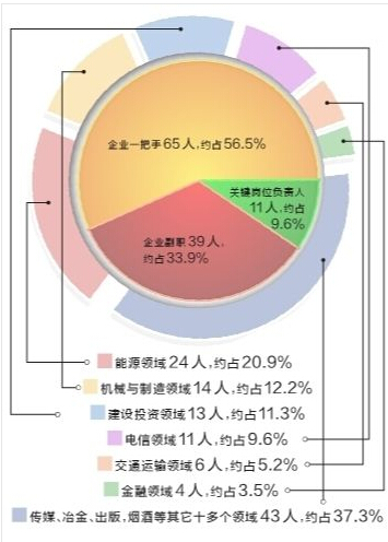 蔣潔敏、王帥廷、宋林、孫兆學、徐建一、廖永遠、王天普,十八大以來,僅“老虎級”國企高管便有7人“落馬”,映射出國企腐敗的嚴重性。中紀委網(wǎng)站去年至今公布的115名“落馬”國企高管從類型上看,其涉案人數(shù)分布為能源領(lǐng)域24人,占20.9%;機械與制造領(lǐng)域14人,約占12.2%;建設(shè)投資領(lǐng)域13人,約占11.3%;電信領(lǐng)域11人,約占9.6%;交通運輸領(lǐng)域6人,約占5.2%;金融領(lǐng)域4人,約占3.5%;傳媒、冶金、出版、煙酒等其它十多個領(lǐng)域43人,約占37.3%。