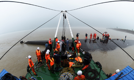 6月2日,救援人員在沉船現(xiàn)場對“東方之星”輪展開營救。 6月1日晚,從南京駛往重慶的客船“東方之星”輪在長江中游湖北監(jiān)利水域發(fā)生翻沉。據(jù)初步統(tǒng)計(jì),事發(fā)客船共有458人,其中旅客406人。