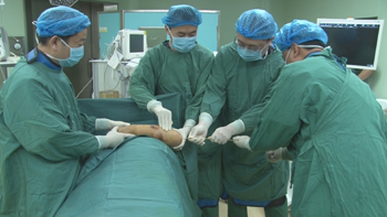 文登整骨醫(yī)院醫(yī)護人員在為橈骨頸骨折患者行骨折閉合穿針內固定術。資料照片 |