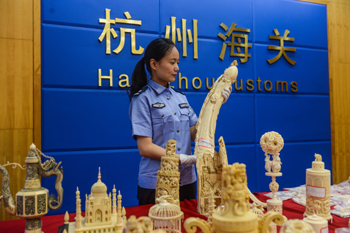 5月28日,杭州海關(guān)宣布,今年已先后破獲利用進(jìn)出境旅檢、郵遞渠道走私瀕危動(dòng)物制品大案,查獲象牙270余公斤。圖為杭州海關(guān)工作人員正在清點(diǎn)查獲的走私象牙,其中不少是精美的工藝品。