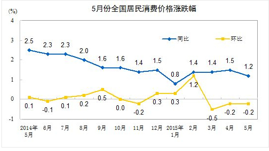 ???? 2015年5月份,全國居民消費價格總水平同比上漲1.2%。其中,城市上漲1.3%,農(nóng)村上漲1.0%;食品價格上漲1.6%,非食品價格上漲1.0%;消費品價格上漲0.9%,服務價格上漲2.1%。1-5月平均,全國居民消費價格總水平比去年同期上漲1.3%。