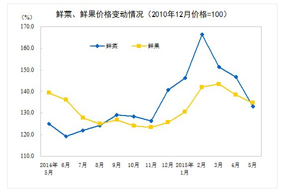 ????5月份,食品價格環(huán)比下降0.9%,影響居民消費價格總水平下降約0.31個百分點。其中,鮮菜價格下降9.2%,影響居民消費價格總水平下降約0.31個百分點;鮮果價格下降2.7%,影響居民消費價格總水平下降約0.07個百分點。肉禽及其制品價格上漲0.8%,影響居民消費價格總水平上漲約0.06個百分點(豬肉價格上漲2.7%,影響居民消費價格上漲約0.08個百分點)。
