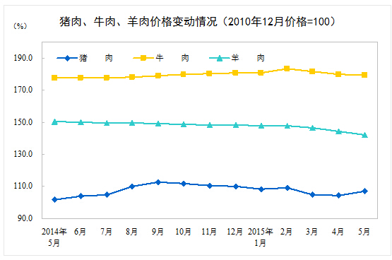 2015年5月份,全國居民消費(fèi)價(jià)格總水平同比上漲1.2%。其中,城市上漲1.3%,農(nóng)村上漲1.0%;食品價(jià)格上漲1.6%,非食品價(jià)格上漲1.0%;消費(fèi)品價(jià)格上漲0.9%,服務(wù)價(jià)格上漲2.1%。1-5月平均,全國居民消費(fèi)價(jià)格總水平比去年同期上漲1.3%。