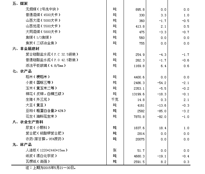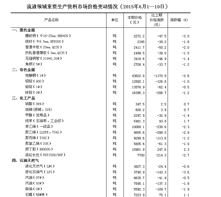 2015年6月上旬,據(jù)對24個(gè)省(區(qū)、市)流通領(lǐng)域9大類50種重要生產(chǎn)資料市場價(jià)格的監(jiān)測顯示,與5月下旬相比,11種產(chǎn)品價(jià)格上漲,32種下降,7種持平。