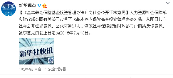 據(jù)新華視點(diǎn)微博消息,人力資源社會(huì)保障部和財(cái)政部會(huì)同有關(guān)部門(mén)起草了《基本養(yǎng)老保險(xiǎn)基金投資管理辦法》稿,從即日起向社會(huì)公開(kāi)征求意見(jiàn)。公眾可通過(guò)人力資源社會(huì)保障部和財(cái)政部門(mén)戶網(wǎng)站反饋意見(jiàn)。征求意見(jiàn)的截止日期為2015年7月13日。