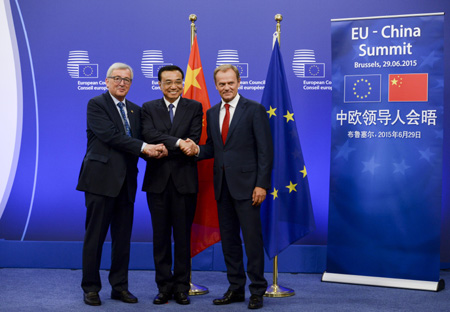 當(dāng)?shù)貢r(shí)間6月29日,國(guó)務(wù)院總理李克強(qiáng)在布魯塞爾歐洲理事會(huì)總部同歐洲理事會(huì)主席圖斯克、歐盟委員會(huì)主席容克共同主持第十七次中國(guó)歐盟領(lǐng)導(dǎo)人會(huì)晤。